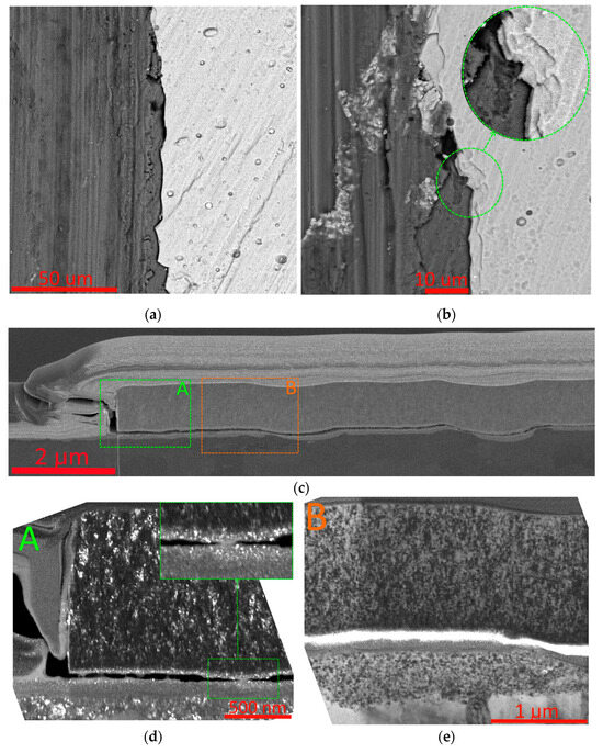 Study of the nature of destruction of the (Zr,Hf)N coating (indentor Al2O3). (a,b) boundary of the fracture area, (c) cross-section of the wear zone boundary area indicating areas for further study, (d,e) delamination in the area of interface between the coating and the substrate.
