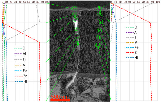 When in contact with the Al2O3 indenter, active cracking followed by a brittle fracture is observed in the (Zr,Ti,Hf)N coating. Figure 9c shows a cross-section of the coating fracture area. On the coating surface, a titanium alloy deposit is extruded from the substrate under the action of the indenter. Diffusion of zirconium from the coating into the deposit is observed. At the boundary of the coating and the substrate, a longitudinal crack is observed passing through the Zr,Hf adhesion layer. A study of the elemental composition of this layer shows a fairly noticeable presence of oxygen (Figure 9c,d, areas 9–12). Thus, it can be assumed that, in this case, there is a preserved layer of titanium oxide that was not completely removed during the ion-etching process.