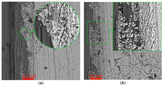 The detachment of the (Zr,Hf)N coating from the substrate occurs not due to the detachment of the coating from the adhesion layer or detachment of the adhesion layer from the substrate but due to a failure in the structure of the Zr,Hf layer itself (see Figure 11d,e). That is, it is this layer that turns out to be the weak link in the substrate–adhesion layer-coating system. When examining the cross-section of the wear zone boundary, it is evident that the coating chipping occurs with the formation of a surface that is almost perpendicular to the substrate surface (Figure 11d). There is a brittle fracture without the formation of a crack network, which is typical for brittle materials. Extended defoliation is also observed on a significantly larger scale than that of the (Zr,Ti,Hf)N and ZrN coatings. Defoliation occurs to a greater extent inside the (Zr,Hf)-layer.