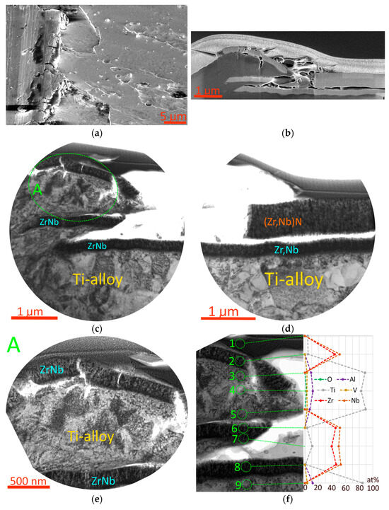 The (Zr,Nb)N coating has relatively low strength and hardness. An area of active cracking and chipping of the coating along the wear boundary is visible (Figure 14a,b). From this point of view, the (Zr,Nb)N coating has opposite properties to the (Zr,Hf)N coating, which is characterized by higher hardness. This type of destruction of the (Zr,Nb)N coating correlates well with its lowest hardness among the studied coatings. Along with low strength, the (Zr,Nb)N coating also demonstrates a rather low adhesion strength to the substrate (Figure 14d). It is evident that the disruption of the adhesive bond occurs predominantly between the Zr,Nb adhesive layer and the coating. At the same time, the Zr,Nb adhesive layer itself, on the contrary, demonstrates very good adhesion to the substrate. This adhesive bond is not disrupted even under conditions of significant plastic deformation (see Figure 14c–e). Analysis of the distribution of elements in the area of indentation of fragments of the destroyed adhesive layer into the substrate material (Figure 14f) shows that oxygen penetration into the substrate structure is possible through cracks in the coating. Both diffusion of Zr and Nb into the substrate and diffusion of substrate elements (mainly titanium) into the coating occur.