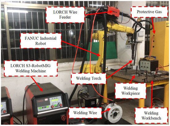 In this work, a FANUC Robot M-10iA industrial robot (FANYS corporation, Oshino-mura, Yamanashi Prefecture, Japan), a LORCH S-RobotMIG (Lorch Schweißtechnik GmbH, Im Anwänder, Auenwald, Germany) arc welding machine, a wire feeder, a welding torch, a control cabinet and some other related auxiliary equipment were employed, which are shown in Figure 1.