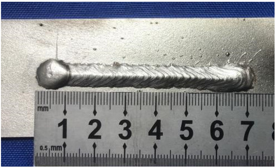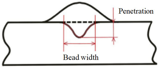 Before conducting the experiments, an angle grinder was employed to eliminate the oxides and other contaminates on the surface of the base metal sheet, and then a special alcohol was used to wash the surface. After the surface was clear and dry enough, welding action could be taken. To reduce deformation, a special fixture was used to tighten and fix the base metal sheet on a workbench. After the welding actions, the appearance of the specimens could be photographed and recorded. A typical weld bead photo is shown in Figure 2. In addition, to obtain the shape and size of the fusion line of the weld bead, metallurgical observation and analysis were conducted for the weld bead. The cutting position was located 3.5 cm away from the starting point of the arc. Because the melting point of 316 L stainless steel was so high, the width of the weld bead obtained from flat surfacing welding was different from the actual weld pool entering the base metal sheets and the depth formed. Hence, in this work, the fusion line is considered a continuous and smooth line below the surface of the base metal sheet, which is shown in Figure 3.