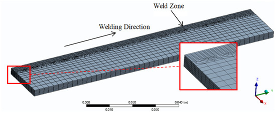 An 8-node hexahedron solid 70 element was employed in this numerical model. Each node in this element had temperature freedom of motion, which allows for three-dimensional transient or static thermal analysis. Because the model was symmetrical along the center line of the weld bead, 1/2 of the geometrical shape was chosen for calculation. After detailed meshing, the number of nodes was 68,469, and the number of elements was 19,597. The size of the element in the center zone of the weld bead was 0.25 mm × 0.25 mm. To guarantee calculation accuracy and efficiency, the density of the mesh near the weld bead was larger, and the other zone, which was far away from the weld bead, had a relatively smaller density. The average quality, using the Jacobin ratio, of all the meshes was 0.83, while the quality, using the Jacobin ratio, of the meshes in the weld bead zone was 0.98. Figure 4 shows the meshing of the parent metal sheet.