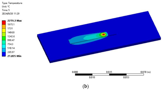 The environmental temperature was set to 22 °C, which was also the initial temperature of the specimen, and the emissivity was set to 0.5. In addition, the model can exchange heat with the surrounding environment during the calculation process, and the main forms of heat exchange included heat convection and heat radiation [19]. The heat exchange between the surface of the weld bead and the surrounding environment was in the form of heat radiation, while the main form of heat exchange between the other surface and the surrounding environment was through heat convection. The corresponding coefficient was 30 W/[m2·°C]. In addition, ideal thermal insulation was added in the section plane that was perpendicular to the horizontal area along the welding direction at the center of weld bead.