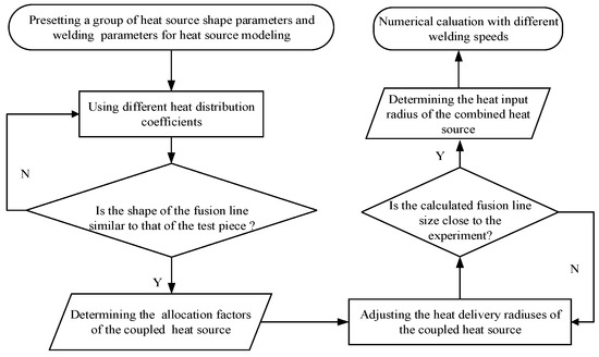 According to the influence of the above parameters of the combined heat source on fusion line formation, the procedure for the confirmation of the parameters of the heat source requires firstly presetting the group parameters of heat source shape and welding process, while at the same time using different combinations of heat distribution coefficients, to conduct numerical calculation. Then, the numerical calculation results can be used to compare the shapes of the fusion lines obtained from the actual experiments so that f1 and f2 can be confirmed, and then the Rs and Rv can be adjusted to further calculate until the calculated size of the fusion line approaches the actual size. Once the parameters of the heat source model are confirmed, the welding speed can be changed for further calculations. Finally, by comparing and analyzing the errors between the numerical calculation and experimental results, the effectiveness of the parameter settings for the combined heat source can be tested. The procedure of confirming the parameters of the heat source is summarized as follows and shown in Figure 7.