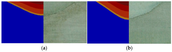 Initially, Rs, Rv and h were set to be 5 mm, 3.5 mm and 3.5 mm, respectively. Input power P was 2.13 kW and electrical arc heat efficiency η was 0.75. The lower surface of the surface heat source should coincide with the upper surface of the cylinder heat source. The welding speed of the combined heat source was 40 cm/min. The size of fusion line and the highest temperature could be numerically calculated using different combinations of f1 and f2, and the results are shown in Table 4. The fusion zone was in the interface between the weld bead and base metal sheet, and in a semi-melted state, and the temperature was close to the melting point of the base metal sheet. The fusion zone was thin. According to a microstructure examination by means of corresponding scope, it was observed that the fusion zone of the weld bead was approximately a fusion line. Because both of the melting points of the base metal sheet and welding wire were about 1370 °C, a temperature color block, whose range was from 1350 °C to 1390 °C, was set in the ANSYS software using the color orange, and this part denoted the welding pool. Apart from this temperature range, other temperatures below this range were set to be another color block using the color blue, so that the contour of the fusion line could be conveniently picked up, and then the corresponding bead width and penetration could be measured.