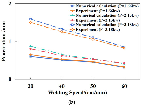 It could be noticed that when the welding speed achieved 60 cm/min, the penetration was small. If the welding speed continuously increased, the penetration would decrease to be much smaller, and the reliability of the joint would not be assured. In addition, according to Figure 10, the maximum errors of the weld bead width and penetration between the numerical calculations and experimental results were 8.75% and 6.22%, and the average errors were below 5%. Hence, the maximum errors were below 9% and the average errors were within 5%. Also, it can be seen in Figure 10 that the errors were acceptable, because the two lines look like they are approaching. Therefore, this shows that the effectiveness and reliability of the parameter settings of the combined heat source model were sufficiently verified. The errors may stem from two aspects. The first was regarding the use of interpolation. Initially, the input radius of the Gaussian surface heat source model was set to be higher than that of the Gaussian cylinder heat source model, and the depth of the cylinder heat source model was also reasonably set, in order to make the Gaussian surface heat source model control the bead width of the fusion line, and the Gaussian cylinder heat source model control the penetration of the fusion line, so by means of adjusting the heat distribution coefficients of the two heat source models f1 and f2 in the combined heat source model, a fusion line with a significant change could be obtained. This method could affect the relationship between the combined heat source model parameters and experimental welding parameters. The second was that during the actual experimental process, fusion line formation may be influenced by temperature, the stability of the welding facilities, the air flow situation and other relative elements, so the experimental results may have a certain variability.