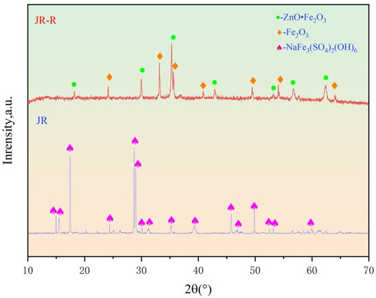 To further investigate the phase composition of the JR, X-ray diffraction (XRD) analysis was conducted on the sample. As shown in Table 1 and Figure 1, the primary phase present in the JR is sodium jarosite (NaFe3(SO4)2(OH)6). After the roasting pre-treatment, the main components of the JR are Fe2O3 and ZnO•Fe2O3.