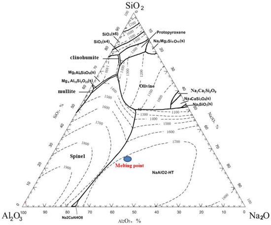 The reduction smelting experiment was conducted using the roasted briquettes of JR. The purpose of this process is to reduce Zn and In, causing them to volatilize and enter the smoke dust while separating them from the slag, and to ensure that Ga enters the pig iron. It is assumed that the slag and iron are completely separated, meaning that Fe and Ga all enter the hot metal and that SiO2, Al2O3, CaO, MgO, and Na2O from the roasted briquettes all enter the slag phase. In this case, the contents of SiO2, Al2O3, CaO, MgO, and Na2O in the slag are as follows: SiO2 = 18.31%, Al2O3 = 27.71%, CaO = 1.75%, MgO = 15.61%, and Na2O = 36.62%, with a basicity of 0.096. The SiO2—Al2O3—Na2O phase diagram (by using FactSage software 8.0) for the fixed slag, with CaO = 1.75% and MgO = 15.61%, is shown in Figure 3. It can be seen that the melting point of this slag is approximately 1700 °C, which is too high and exceeds the requirements for conventional electric furnace smelting. Therefore, adjustments to the slag system are necessary to reduce the melting point and viscosity of the slag as much as possible to meet the requirements of conventional electric furnace smelting.