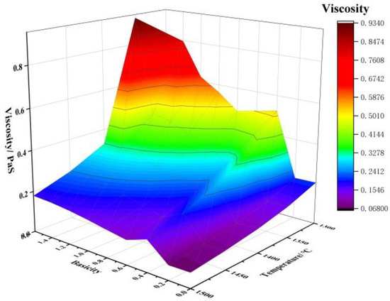 Apart from the melting point, viscosity is an important property of slag, which affects whether the smelting process can proceed smoothly and whether the metal can adequately settle and separate through the slag layer [31]. Therefore, the smelting process requires slag with appropriate viscosity. The liquid phase amount and viscosity of the initial slag during the smelting separation of JR briquettes at 1300–1500 °C under different basicities were calculated using the Equilib and Viscosity modules of the thermodynamic software FactSage 8.0. The Viscosity module in the software applies to fully liquid phases, whereas the initial slag at lower temperatures is not entirely liquid, necessitating correction using the Einstein–Roscoe equation, as shown below [8]:
