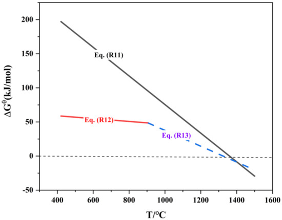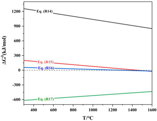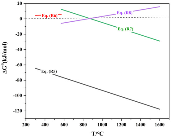 The standard Gibbs free energy of a chemical reaction serves as the criterion for determining whether a reaction can proceed. When ΔrGΘm = 0, the reaction reaches equilibrium; when ΔrGΘm < 0, the reaction proceeds in the forward direction; and when ΔrGΘm > 0, the reaction proceeds in the reverse direction. In this study, the calculation of the standard Gibbs free energy for the relevant chemical reactions was performed using the FactSage software.