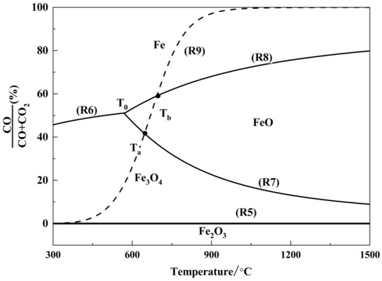 As shown in Figure 6, the equilibrium curve for the reaction between Fe2O3 and CO is close to the x-axis, indicating that the equilibrium CO concentration, φ(CO), is approximately 0. This implies that even trace amounts of CO in the system can reduce Fe2O3 to Fe3O4. The equilibrium curve of the carbon gasification reaction intersects with the equilibrium curves of the indirect reduction reactions of Fe3O4 and FeO at points Ta (683 °C) and Tb (718 °C), respectively. When T < Ta, the CO concentration in the system is lower than the equilibrium CO concentration for the indirect reduction reactions of Fe3O4 and FeO, and Fe3O4 is the stable phase in the equilibrium system. Within the temperature range Ta < T < Tb, the CO concentration in the system exceeds the equilibrium CO concentration for the indirect reduction reaction of Fe3O4, and FeO becomes the stable phase in the equilibrium system. When T > Tb, the CO concentration in the system is higher than the equilibrium CO concentration for the indirect reduction reaction of FeO, and metallic Fe becomes the stable phase in the equilibrium system. Thus, to ensure the reduction of high-valence iron oxides to metallic iron, it is theoretically sufficient to provide an adequate amount of reductant and maintain the reaction system at a temperature above 718 °C.