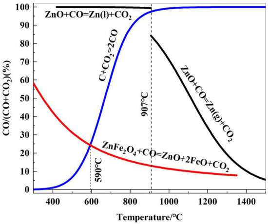 As shown in Figure 8, zinc ferrite is difficult to reduce at temperatures below 590 °C. When the reduction temperature exceeds 590 °C, zinc ferrite is reduced to ZnO and FeO, and the reduction process becomes increasingly favorable as the temperature rises. Below 907 °C (the boiling point of zinc), ZnO cannot be reduced by CO. However, at temperatures above 907 °C, ZnO is reduced by CO to form gaseous metallic zinc, and the reduction becomes more favorable with increasing temperature.