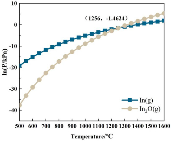 Based on Equations (R18) and (R19), the relationship between the partial pressures of In(g) and In2O(g) with temperature in the In-C-O system is shown in Figure 10. As depicted in Figure 10, the partial pressures of In(g) and In2O(g) gradually increase with rising temperature. When the temperature is below 1256 °C, the partial pressure of In(g) exceeds that of In2O(g), and the main reduction product of In2O3 in the system is In(g). Conversely, at temperatures above 1256 °C, the main reduction product of In2O3 shifts to In2O(g).