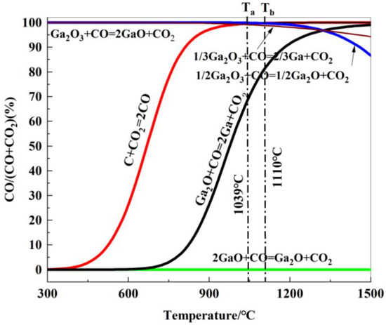 As seen in Figure 12, the equilibrium curve for the reaction between Ga2O3 and CO is close to the 100-axis, indicating that the equilibrium CO concentration, φ(CO), is approximately 100. This means that Ga2O3 cannot be reduced by CO to form GaO. The equilibrium curve for the carbon gasification reaction intersects with the indirect reduction reaction curves for the formation of Ga and Ga2O from Ga2O3 at points Ta (1039 °C) and Tb (1110 °C), respectively. The equilibrium curve for the reduction of Ga2O by CO lies below the equilibrium curve for the carbon gasification reaction, suggesting that Ga2O can be reduced to Ga.