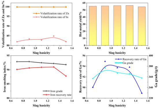 1. Increasing the smelting temperature can increase the superheating degree of slag, reduce slag viscosity, facilitate the settlement and aggregation of metal particles, and reduce mechanical inclusion losses. Extending the smelting time helps promote the slag–iron interface reaction towards an equilibrium, thereby improving the metal recovery rate. Within an appropriate range of basicity, the good fluidity of the slag favors the separation of iron and gallium from the slag.