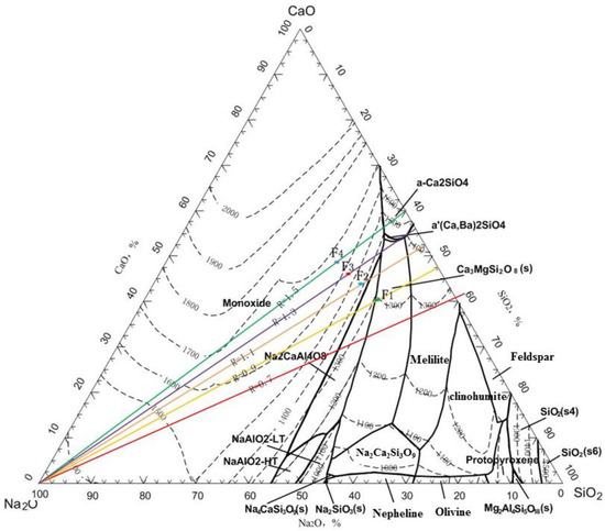 The typical high furnace slag contains 15% Al2O3, 8.0% MgO, and a slag basicity of 1.0–1.1 [28,29,30]. Therefore, the designed slag basicity is 1.1, Al2O3 content is 15.0%, MgO content is 8.0%, and the slag composition is 31.55% CaO, 28.62% SiO2, 15.0% Al2O3, 8.0% MgO, and 16.83% Na2O. According to the CaO-SiO2-Na2O-Al2O3-MgO five-component slag phase diagram, the melting point of the slag composition is 1450–1500 °C (see point F2 in Figure 14). Therefore, the additional mass of SiO2, Al2O3, CaO, and MgO fluxes added to 100 kg of roasted briquette (considering the SiO2, Al2O3, CaO, and MgO brought in by the coke ash) is as follows: MSiO2 = 2.76 kg, MAl2O3 = 0.31 kg, MCaO = 4.2 kg, MMgO = 0.11 kg.