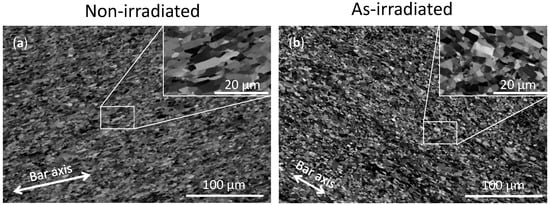 For the PIA bar, after annealing at 1550 °C, abnormal grain growth, i.e., the pronounced growth of grains in a particular crystallographic direction relative to others, is observed. This is evident from the double log-normal peak shown in Figure 2 with parameters presented in Table 2. The microstructure exhibits a wide distribution of grain sizes, with some grains reaching up to 100 μm in diameter, while smaller subgrains, approximately ~2 μm in size, remain detectable. This abnormal grain growth suggests that grain growth has not been completed yet for the irradiated bar after PIA at 1550 °C, indicating an increased recrystallization resistance resulting from the prior neutron irradiation.