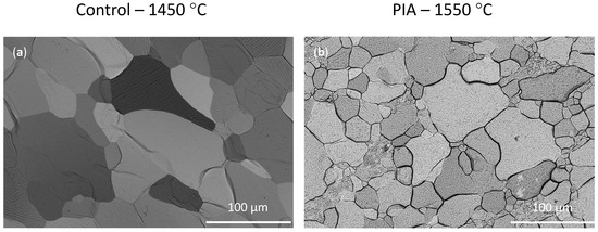 SEM images showing significant grain growth are presented in Figure 3, with the control sample annealed at 1450 °C and the irradiated sample after PIA at 1550 °C.