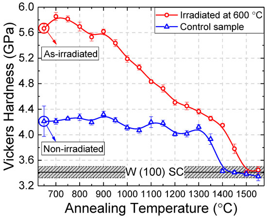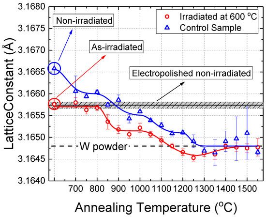 The lattice constants, as determined from the position of the W Bragg peaks in the XRD patterns, for the irradiated and control samples after each step of isochronal annealing are presented in Figure 9, along with the lattice constants of the respective electropolished non-irradiated samples.