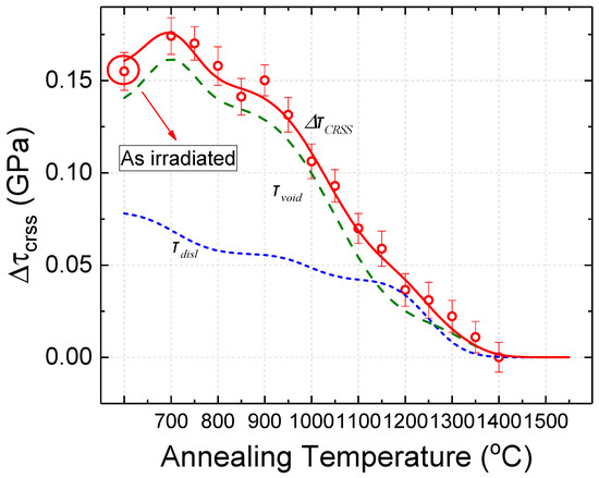 To analyse the recovery processes involved in resistivity, using the Matthiessen’s rule [106], the radiation-induced resistivity, , which is the difference between the resistivity of the irradiated sample, , and that of the non-irradiated, = (5.62 ± 0.02) μΩ·cm, can be expressed as [95]: