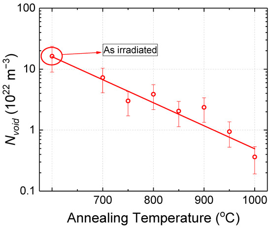 The relative intensities of the positron lifetime components can provide additional information regarding the evolving microstructure. The relative intensity, , is proportional to the trapping rate, , of the defect. The positron trapping rate is equal to the defect number density, , multiplied by the trapping strength, , of the defect [100], i.e., . An increase in the relative intensity of the long lifetime, , such as that after PI annealing from 950 to 1100 °C, could either indicate a decrease in the dislocation density or an increase in the trapping strength of the voids with increasing void size. The vacancy cluster positron trapping rate, however, has been shown to increase almost linearly with the number of vacancies in the cluster [101], and the increase is expected to slow down as the number of vacancies increases [102]. Thus, the increase in void size with the accompanied decrease in void density, even in the case of perfect conservation of vacancies, cannot be attributed to an increase in the trapping rate of voids. Therefore, the increase in the relative intensity of the long lifetime, , is solely attributed to the reduction in the dislocation density. The reduction in relative intensity at temperatures above 1250 °C can be attributed to void dissolution (Figure 5b). Complete void dissolution is observed following PIA at 1450 °C.