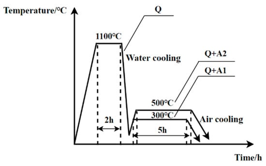 In order to obtain a single and stable structure, eliminate the non-uniformity of the as-cast structure of the material, and explore the effect of the aging temperature on the microstructure and comprehensive properties of light wear-resistant steel, the light wear-resistant steel was heat-treated with the following processes: (1) 1100 °C holding heat for 2 h solution treatment; (2) 1100 °C holding for 2 h solution treatment +300 °C holding for 5 h aging treatment; and (3) 2 h solution treatment at 1100 °C + 5 h aging treatment at 500 °C. The heat treatment process curve is shown in Figure 1. In order to facilitate the description below, the heat treatment process of Fe-28Mn-8.5Al-1.0C steel was defined as Q and Q + A1/A2, respectively.