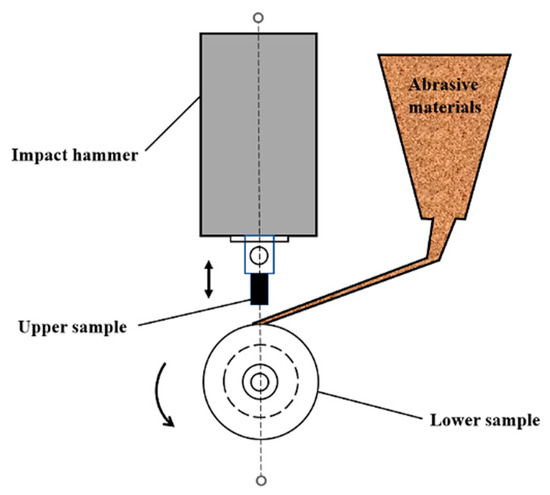 The MLD-10B dynamic load abrasive wear testing machine was used to test the wear resistance of the material, and 1 J and 4 J of impact energy were selected for the material experiment. The structural principle of the testing machine is shown in Figure 2. The upper sample is the standard sample (test material), driven by a 10 kg punching hammer to perform the cyclic up and down movement at the impact frequency of 200 times/min. The lower sample is a circular counter-grinding sample; the outer circle’s diameter is φ50 mm; the inner circle’s diameter is φ30 mm; and the thickness is 15 mm, driven by the motor spindle at the speed of 200 r/min, performing rotary reciprocating counter-grinding. Among them, the lower sample (grinding sample) is tempered 45 steel (0.44%C, hardness 58HRC). The abrasive is made of special quartz sand with a diameter of 1.5~2.36 mm, and the abrasive flow rate is 20 kg/h. The test time of each sample was 1 h, and three experiments were conducted under each impact energy. After the experiment was completed, acetone solution and anhydrous ethanol solution were used to clean the material in the ultrasonic cleaning instrument for 180 s, respectively. The electronic balance with 0.1 mg accuracy was used to weigh each sample three times, and the average value of the weighing data was taken as the wear result.