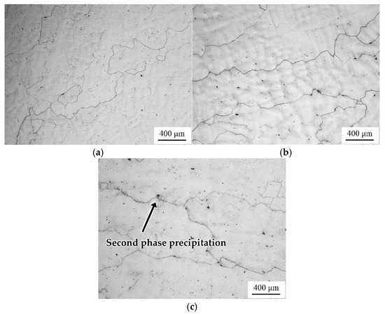 The optical microscopy (OM) morphology of Fe-28Mn-8.5Al-1.0C steel under different heat treatment conditions is shown in Figure 3a–c. OM images show that the microstructure matrix of Fe-28Mn-8.5Al-1.0C steel under the three heat treatment processes is austenite. After aging treatment, different sizes of second-phase precipitation are observed in austenite grains and between grain boundaries. With the increase in the aging temperature, the size of granular second-phase precipitation increases. The area ratio of the second-phase precipitation in Q + A1 and Q + A2 processes is about 1.02% and 1.83%, respectively. It can be seen that the amount of second-phase precipitation increases with the increase in the aging temperature. OM images show the average grain size of Fe-28Mn-8.5Al-1.0C steel under the conditions of Q, Q + A1, and Q + A2 is 1016 ± 382 μm, 943 ± 352 μm, and 934 ± 378 μm, respectively. With an increase in aging temperature, the grain size of the material changes little. This is similar to the findings of other scholars [19,20]. According to the Hall–Petch theory, the relationship between the influence of fine-grain strengthening on the material is as follows: