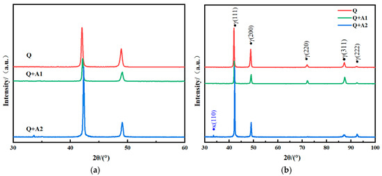 As OM images could not be used to determine the type of second-phase precipitation and other information, X-ray diffraction analysis was conducted on Fe-28Mn-8.5Al-1.0C steel under different heat treatment processes, and the XRD pattern is shown in Figure 4. No phase transition was observed under the three heat treatment conditions, similar to the results found by Shin et al. [22]. The diffraction peak that can be observed in the pattern of Q and Q + A1 processes is the γ phase; that is, the phase composition inside the material analyzed according to the XRD pattern is a single austenite. When the aging process is held at 500 °C for 5 h (Q + A2), the diffraction peak of κ (110) appears in the XRD pattern at the diffraction angle of 33°, and the second phase is precipitated into (Fe, Mn)3AlC κ-carbide [23,24,25,26,27]. The local magnification image shows that, compared with the Q process, the position of the γ(111) diffraction peak is shifted to the right, and the degree of deviation of the diffraction peak is increased when the aging temperature is further increased to 500 °C (Q + A2), which is related to the appearance of the second-phase precipitation dominated by κ-carbide. The saturated austenitic steel rich in Al, Mn, and C elements has an amplitude-modulating decomposition in the aging process, and the Al and C atoms are arranged in an orderly manner, which results in the transformation of M3C carbides into κ-carbides [14]. At the same time, the solid solubility of the austenite matrix decreases, and the lattice constant of the γ phase decreases. According to the Bragg equation, the lattice spacing d is inversely proportional to the diffraction angle θ, so the position of the γ-phase diffraction peak shifts to the right, supporting the results of the statistical analysis observed in the OM images above.