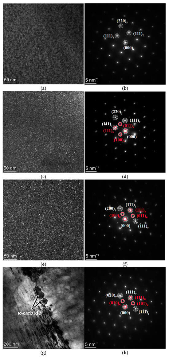 With the increase in aging temperature, the volume and quantity of κ-carbide increase, which is consistent with the above experimental results. At the same time, in the Q + A2 process, the average diameter of about 86 ± 15 nm was observed in the internal grain boundary of the material, and the continuous distribution of κ-carbides was observed in bulk (Figure 5g,h). This also indicates that κ-carbides grow in the matrix grain and grow in the grain boundary at the same time during heterogeneous phase precipitation [27]. The experimental results and related data show that there is a certain orientation relationship between austenite and κ-carbide, <100>κ//<100>γ and {010}κ//{010}γ [29,30]. The influence of κ-carbide on the comprehensive properties of materials is very important, and the influence of κ-carbide precipitated at different locations on the properties is also different [31,32,33].