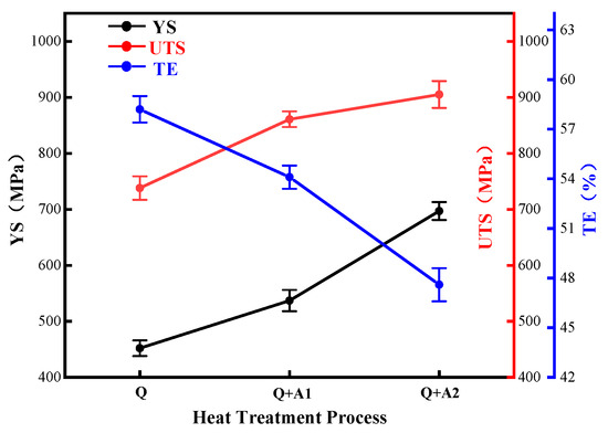 It was calculated that the contribution of fine-grain strengthening to the yield strength under Q, Q + A1, and Q + A2 processes is 11 MPa, 12 MPa, and 12 MPa, respectively. It can be seen that fine-grain strengthening has little effect on the yield strength of the material.