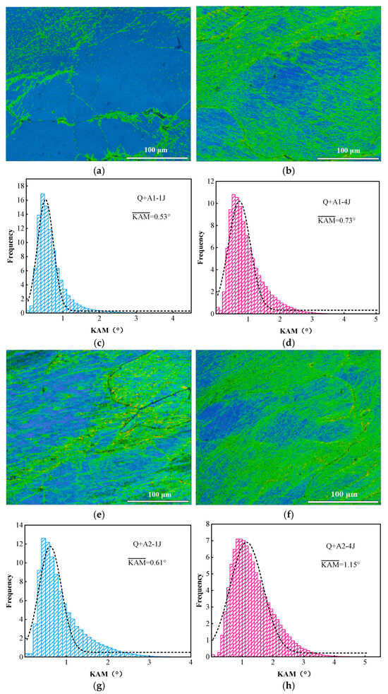 A statistical figure of KAM and the average value of the wear edge of Fe-28Mn-8.5Al-1.0C material under different impact energies after aging treatment: (a,c) Q + A1 − 1 J; (b,d) Q + A1 − 4 J; (e,g) Q + A2 − 1 J; (f,h) Q + A2 −; 4 J.