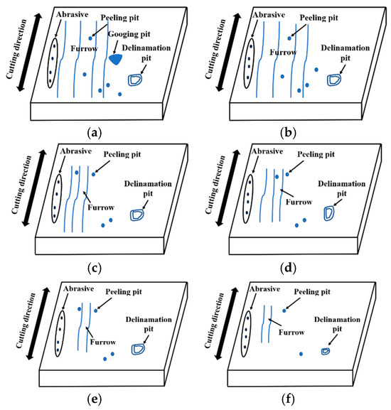 For ease of comparison and understanding, Figure 10 shows a schematic diagram of the SEM morphology of the wear surface. After solid-solution treatment (Q), the wear surface morphology of the material after different impact work is dominated by a large area of furrowed trenches (Figure 9 and Figure 10a,b), accompanied by a few spalling pits and stratified pits generated by plastic deformation. Under 1 J of impact work, there are chiseling pits on the wear surface of the material, indicating that the hardening degree of the material surface under this impact work is not high. A large area of wear defects is produced, and further weight loss is achieved. Under 4 J of impact work, the wear surface is not much different from that of 1 J, and no chiseling pits are found, indicating that the increase in impact work improves the material surface’s work-hardening degree, thus having a good wear-resistant effect.