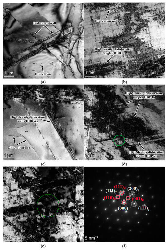 Figure 11a,b shows that there are staggered dislocation walls and relatively scattered dislocations on the wear subsurface under 1 J of impact work. When the impact energy is increased to 4 J, the number and width of dislocation walls increase, with an average distance of 400~600 nm, and high-density dislocation entanglement (HDDT) appears in some areas. When the aging temperature was increased to 500 °C (Q + A2), the subsurface morphology of the material under 1 J of impact energy did not change much compared with that of Q + A1 (Figure 11c), showing a typical dislocation wall morphology. However, the restriction effect on dislocation movement was stronger, the dislocation density in the wall was higher, and the width of the dislocation wall was also larger. The subsurface topography of 4 J of impact energy shows a large-area high-density dislocation wall (HDDW) and dislocation entanglement (Figure 11d). The average distance of the dislocation wall is about 200~300 nm. SAED image calibration in some high-density dislocation entanglement shows that the structure is composed of austenite + κ-carbide. At the same time, the proportion of dislocation entanglement under the Q + A2 process is higher, which indicates that the increase in aging temperature under the same impact work condition leads to a higher dislocation density and a smaller dislocation movement distance on the subsurface of the material. Moreover, κ-carbide has a significant effect on the dislocation density [49,50].