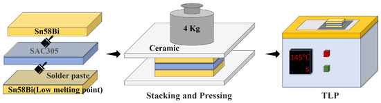 The preparation process is outlined in Figure 1. First, Sn58Bi and SAC305 solder were rolled into 50 ± 2 μm and 75 ± 2 μm thick sheets. These sheets were then cut into (10 ± 0.1) × (5 ± 0.1) mm pieces, cleaned with anhydrous ethanol and deionized water to remove contaminants, and coated with a thin, uniform layer of Rosin-based flux on the contact surfaces. The sheets were stacked and placed between two ceramic sheets. Then, at room temperature, they were pressurized with 4 kg weights for 1 h to ensure tight bonding and remove excess flux. A titanium sheet was used as the substrate to prevent the loss of Sn58Bi during melting. The solder was then heated on a hotplate at 145 °C for a specified period to establish a metallurgical bond between Sn58Bi and SAC305. To minimize the influence of layer thickness on heat transfer, the heating time was set to 20 s for 3 layers, 25 s for 5 layers, 30 s for 7 layers, and 35 s for 9 layers, ultimately forming a composite solder with a layered structure.