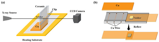 The Shanghai Synchrotron Radiation Facility (SSRF, Shanghai, China), with the specific use of the BL13W1 beamline, was used to observe the interaction between the two solders during the heating and holding process of the layered composite solder. These data were combined with electron backscattering images to explain the evolution mechanism of the microstructure. The synchrotron radiation samples were prepared, as shown in Figure 2a. Before soldering, the copper foil cross-sections were polished to remove scratches, and the copper foil was bent to support the samples and enhance thermal conductivity. The clamping edges of the fixture were tightly attached to the contact edges of the solder sheet and copper foil to prevent the flow of liquid solder into the gap during soldering. The test beam energy was set to 25 keV, and the imaging resolution was 0.37 μm/pix.