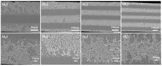 The backscattered image of the cross-section of the prepared layered composite solder sheets is shown in Figure 3. As per the design, the outermost layers consist of Sn58Bi with a reticulated eutectic structure. In Figure 3(a1), the three-layer solder is composed of a sandwich structure of Sn58Bi/SAC305/Sn58Bi, where the white region in the Sn58Bi layer represents the Bi-rich phase, the gray region is β-Sn, and the SAC305 layer appears as a uniform gray. The structures of the other layers are similar. Figure 3(a1–d1) show that the 3-layer, 5-layer, 7-layer, and 9-layer solders maintain a well-defined layered structure with no visible pores or residual flux at the interfaces, indicating strong interlayer bonding. Higher-magnification images (Figure 3(a2–d2)) reveal that elemental diffusion has occurred at the interface, forming a sub-eutectic structure, while the SnBi layer, far from the SAC305 layer, retains its original reticulated eutectic structure.