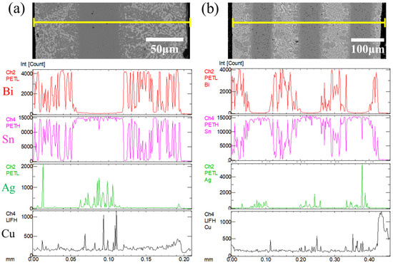 Line scan analyses were conducted along the vertical interface direction on the cross-sections of the 3-layer and 7-layer solders, as shown in Figure 4. The elemental distribution aligns with the observed microstructure. Due to the low heating temperature and short duration, metallurgical bonding between the SnBi and SAC305 layers occurs primarily at the interface, with insufficient diffusion of the elements. Bi predominantly resides in the SnBi layer, while Ag and Cu are primarily located in the SAC305 layer. A notable concentration gradient exists between the Sn58Bi and SAC305 solders, with substantial differences in element distribution.