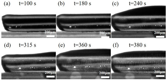 Time-resolved synchrotron radiation imaging of interfacial fusion in 7-layer solder with Cu substrate: (a) t = 100 s, (b) t = 180 s, (c) t = 240 s, (d) t = 315 s, (e) t = 360 s, (f) t = 380 s.
