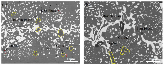 The composition of intermetallic compounds in the post-soldering microstructure of the layered solder was analyzed, and the corresponding atomic percentages are presented in Table 2. Based on the types and atomic percentages of the elements present, it is inferred that the white-bordered phases “1” and “2” in Figure 8a are Ag3Sn, while the dark gray phases “3” and “4” are Cu6Sn5. The phase distribution in the cross-sectional microstructures of the layered solder joints and the melt-cast solder joints is shown in Figure 8a,b. The gray base corresponds to the Sn-rich phase, while the reticular and granular white phases represent the Bi-rich phase. The gray particles with white boundaries in the matrix are Ag3Sn, and the dark gray particles are Cu6Sn5.
