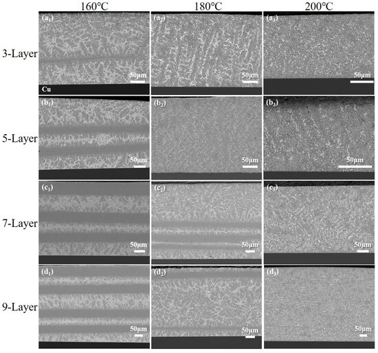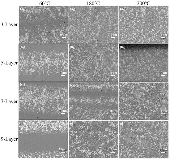 After soldering at 200 °C (Figure 10(c3,d3)), the sub-eutectic structure becomes finer compared to the structure after soldering at 180 °C. The Bi particles in the 3-layer and 5-layer solders become finer and more dispersed. Diffuse Ag3Sn and Cu6Sn5 particles are observed in the 3-, 5-, 7-, and 9-layer solder, and the distribution of these particles becomes more uniform with an enhanced refining effect as the temperature increases.
