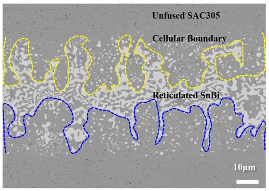 - The alternating layers of SAC305 and Sn58Bi enable controlled element diffusion during reflow. Bi diffusion into SAC305 reduces segregation, while the partial dissolution of SAC305 into molten Sn58Bi forms a sub-eutectic structure. Synchrotron imaging reveals that cellular interfaces arise from compositional supercooling, driven by localized Bi enrichment and rapid solidification at the solid–liquid boundary.
