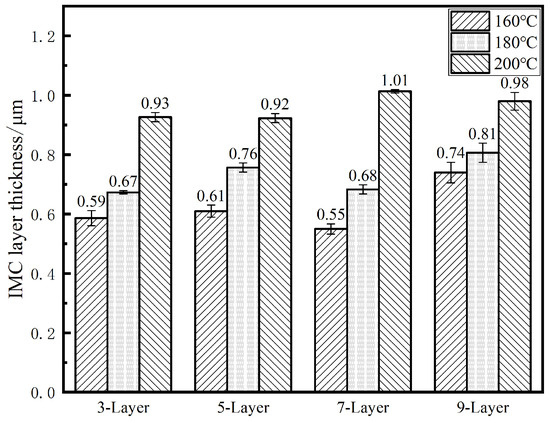 Variation in IMC thickness at the interface of 3-, 5-, 7-, and 9-layer solder joints under different soldering temperatures.