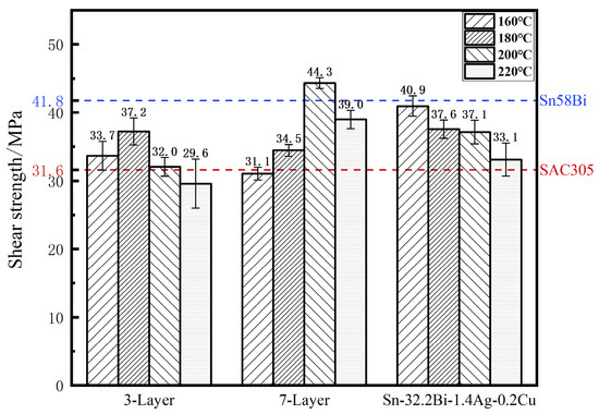 Figure 14 illustrates the shear strength of Cu/solder/Cu joints after reflow of 3-layer composite solder and 7-layer composite melt-cast state solder at different temperatures. For comparison, the shear strengths of Cu/Sn58Bi/Cu joints after reflow at 180 °C and Cu/SAC305/Cu joints after reflow at 250 °C were also tested, with values of 41.8 ± 1.1 MPa and 31.6 ± 1.4 MPa, respectively.