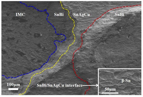 As shown in Figure 15, the joint fracture of the 3-layer composite solder reflowed at 160 °C is characterized by incomplete fusion of the SnBi and SnAgCu solders. Due to the varying degrees of deformation of these two solders under the same shear load, the SnBi/SAC interface becomes the weak link of the joint, resulting in fracture occurring at this interface, which exposes the SnAgCu in the interlayer (Figure 16). Due to the low reflow temperature, there is less Cu6Sn5 at the interface at the fracture, and smooth Cu surfaces are exposed in some areas. As the reflow temperature increases, the amount of interfacial Cu6Sn5 increases, and the IMC interfacial strength improves. However, the excessive thickness of Cu6Sn5, a hard and brittle phase, leads to the degradation of joint performance. Consequently, the proportion of fractures occurring at the IMC/solder interface increases at 200 °C and 220 °C, resulting in a corresponding decrease in shear strength.