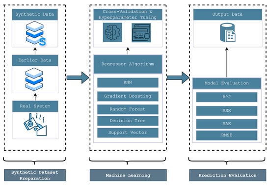 At the core of this study is an intelligent system designed to optimize metallurgical processes by leveraging machine learning techniques. The system follows a structured workflow comprising three main stages: synthetic dataset preparation, machine learning modeling, and prediction evaluation. Figure 1 provides an overview of this workflow. Initially, real-world data from the metallurgical process are used to generate synthetic data to create a comprehensive dataset. This dataset is then used to train regression models, with cross-validation and hyperparameter tuning applied to enhance performance. The software used in this study are Python (3.10.2) for scripting, NumPy (2.1.3) and Pandas (2.2.3) for synthetic data computation, and scikit-learn (1.4.2) for machine learning modelling.