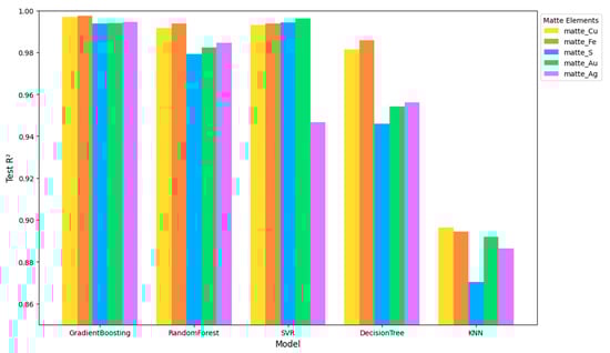 The forward prediction task, which aimed to estimate the composition of the matte and slag from given ore characteristics, yielded strong overall performances across most models tested. As shown in Table 3, the Gradient Boosting Regressor emerged as a top performer, achieving an R2 of 0.9951 on the test set and substantially lower error metrics (Test MSE = 29.6716, Test MAE = 1.9327, Test RMSE = 5.4472) than the other models. This high R2 indicates that the Gradient Boosting model captured nearly all the variance in the outputs, suggesting that the complex ensemble structure effectively modeled the non-linearities and intricate relationships inherent in the pyrometallurgical system. The performances of the models in predicting matte and slag are shown in Figure 2 and Figure 3, respectively.