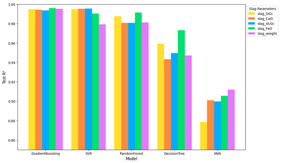 A closer look at the predictions for specific matte and slag components (Table 4 and Table 5) reinforces these findings. Gradient Boosting consistently outperformed other models across all matte outputs (Cu, Fe, S, Au, Ag), with R2 scores often exceeding 0.99 (Figure 2). Similarly, for slag composition (Figure 3), Gradient Boosting delivered near-perfect R2 values (e.g., FeO at 0.9961), indicating remarkable precision. The SVR and Random Forest performed nearly as well, achieving R2 values greater than 0.99 for most matte and slag components, underscoring that advanced, flexible models are particularly well suited for forward prediction tasks in pyrometallurgy.