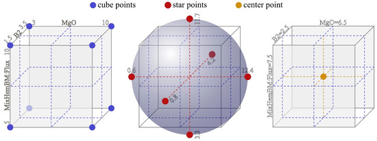 A Design of Experiments (DoE) approach was employed in order to analyze the effect of various factors on Li and F evaporation—their distribution to the gas phase. The experimental design included three factors: basicity (B2, CaO to SiO2 mass ratio), MgO content (MgO, wt.% in the added flux), and the BM-Fe2O3 mixture to flux ratio (MixHemBM:flux, Equation (1)). The minimum and maximum levels of these factors are set as listed in Table 2. These levels were initially set based on EAF slag compositions reported in the literature [6,7], and the range was broadened to better observe the effects.